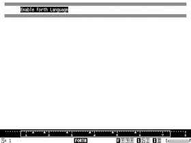 Nevertheless, although officially undocumented, a gateway to Forth remains in the Cat. It is triggered by a straightforward — albeit unlikely — series of keystrokes, which works in both MAME and the real hardware. Start out by typing Enable Forth Language (easiest in a blank document or workspace). Highlight it by pressing both LEAP keys. Now press USE FRONT-ANSWER (usually your backspace or [Mac] delete key). The bottom of the screen will flash and/or a real Cat will beep, and a little "FORTH" icon will briefly light and then disappear. When the FORTH icon has disappeared, press SHIFT-USE FRONT-SPACE. Nothing will appear to happen until you hit RETURN/ENTER a few times ... and get a Forth ok prompt. Lock this change in by typing the magic incantation -1 wheel! savesetup re and press ENTER. This enables "expert mode" and saves it to battery-backed settings RAM, then returns to the editor. Now the Forth mode is unlocked, and the hacking can begin. In future you won't need to do the "Enable Forth Language" dance again as long as your settings RAM or battery doesn't get whacked.Forth is accessed in two ways, one of which you just saw for entering commands at a traditional REPL-like prompt. This is the mode we will primarily be using, and is fully supported by the operating system, but the other fashion is clearly more Raskinesque. Remember how you could highlight expressions and have the Cat compute them?